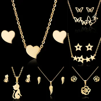 Rinhoo-Conjunto de pendientes de acero inoxidable para mujer, conjunto de collar, copo de nieve, flor, rosa, mariposa, ala, gato, árbol de coco, estrella, cerdo