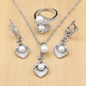 Conjunto de joyería de plata 925 para mujer, juego de collar con perlas blancas de circonita, Pendientes colgantes de boda, anillos abiertos, juego de collar de la noche de la Glory