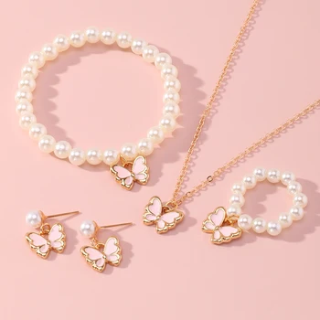 Pendientes colgantes de mariposa rosa para mujer y niña, conjunto de collar y pulsera de perlas de imitación, temperamento de moda, estilo Y2K