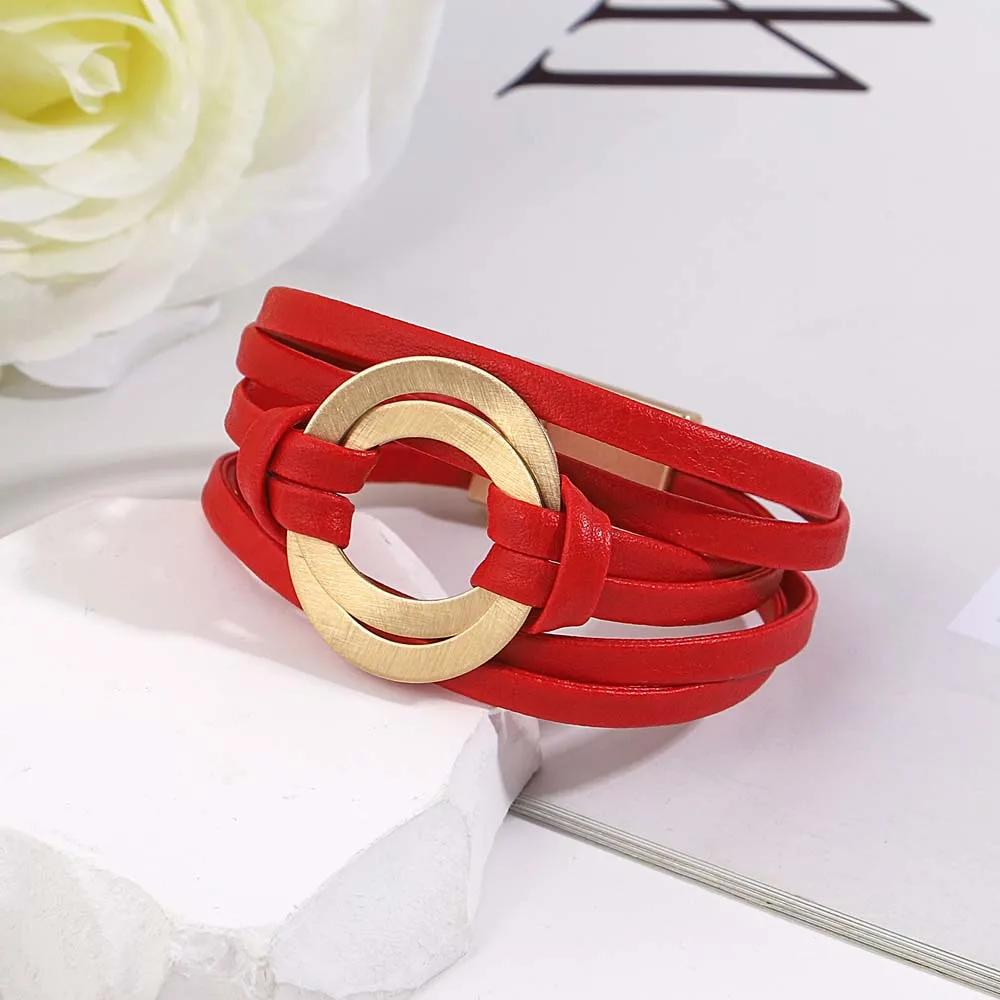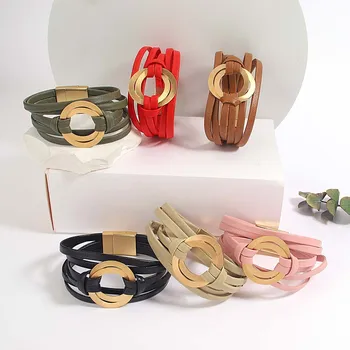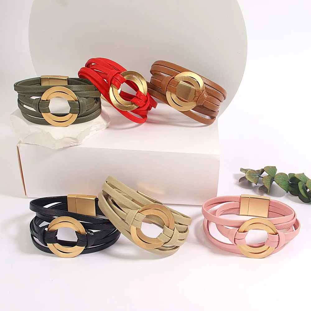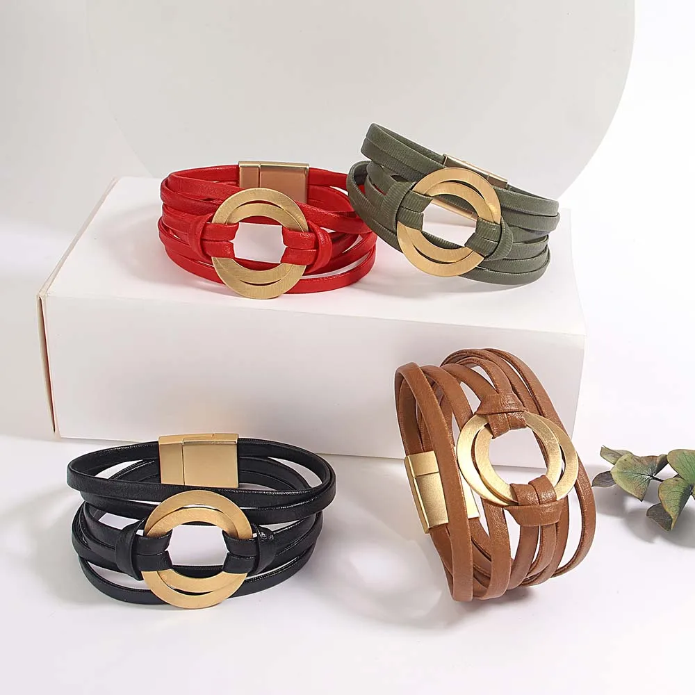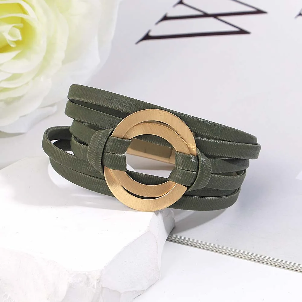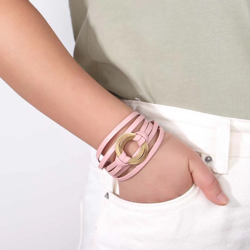 Amorcome-Pulseras clásicas de doble círculo para mujer, brazalete de cuero genuino suave, joyería