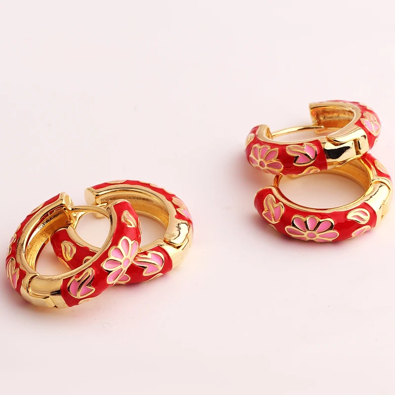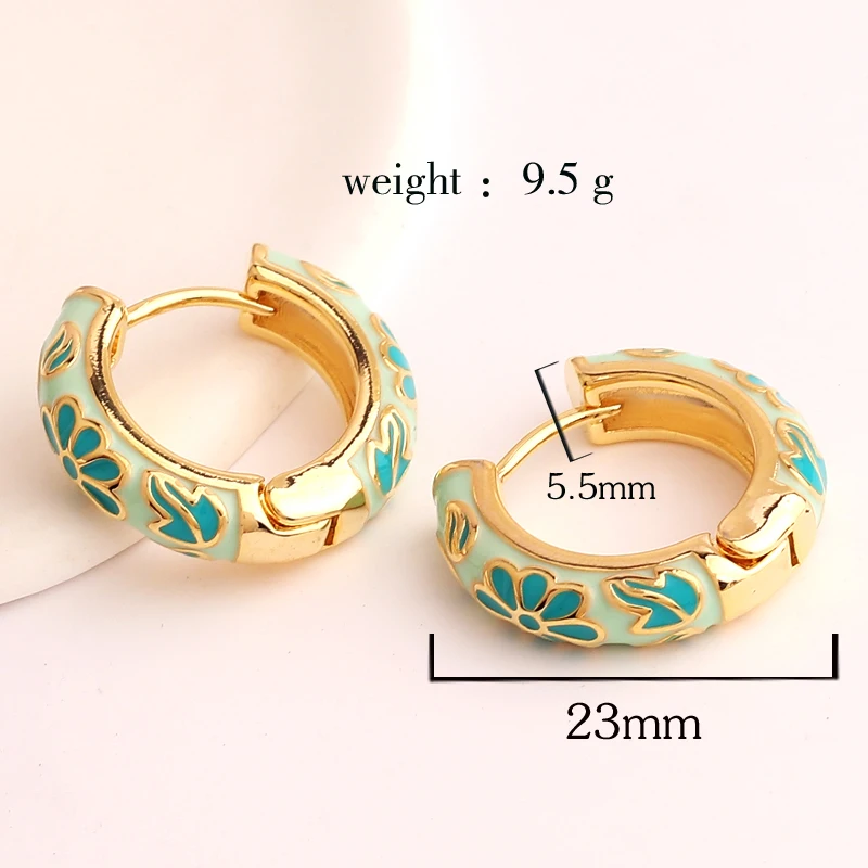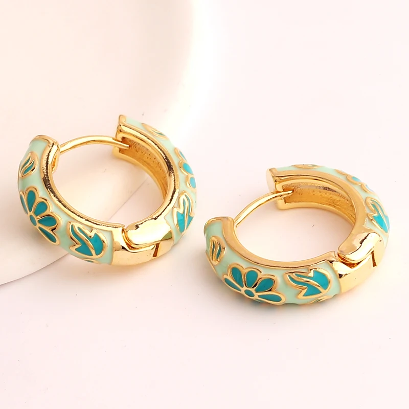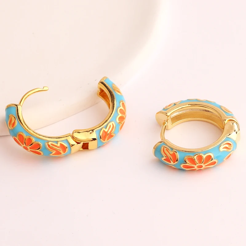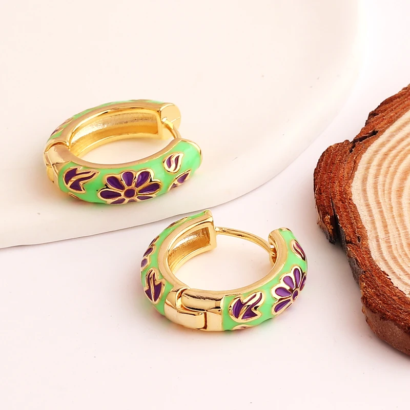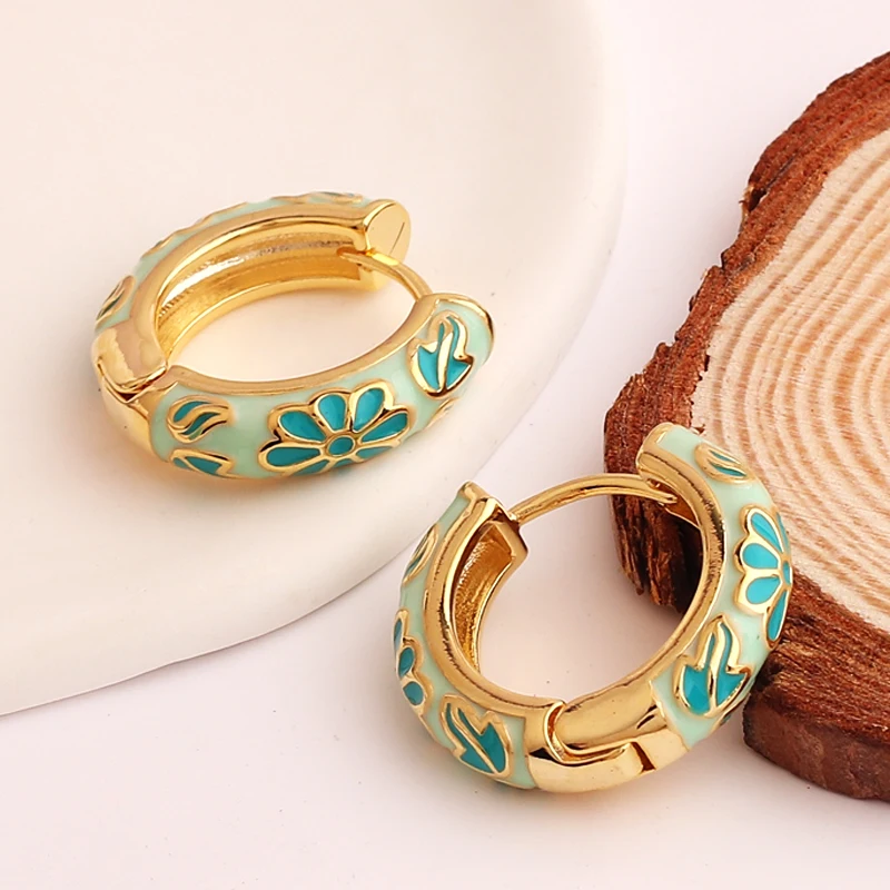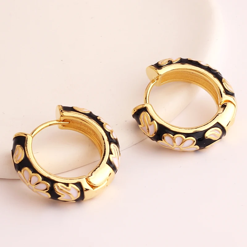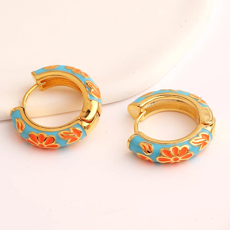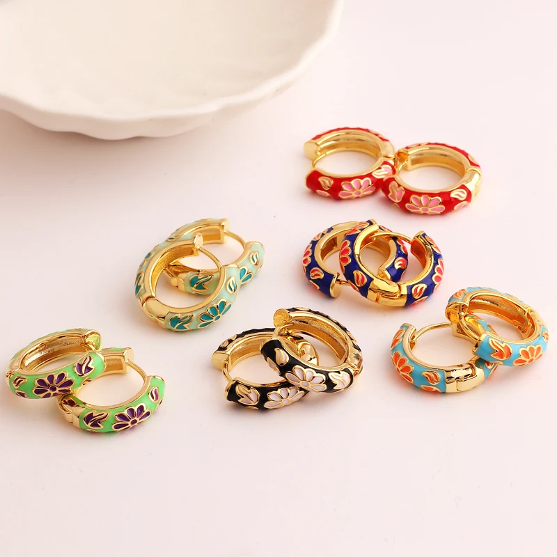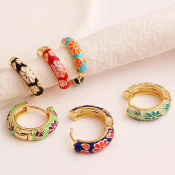 Pendientes de aro de círculo redondo grueso para mujer, flor de esmalte llena de oro, Margarita, hebilla de oreja de cobre, joyería Huggies para mujer