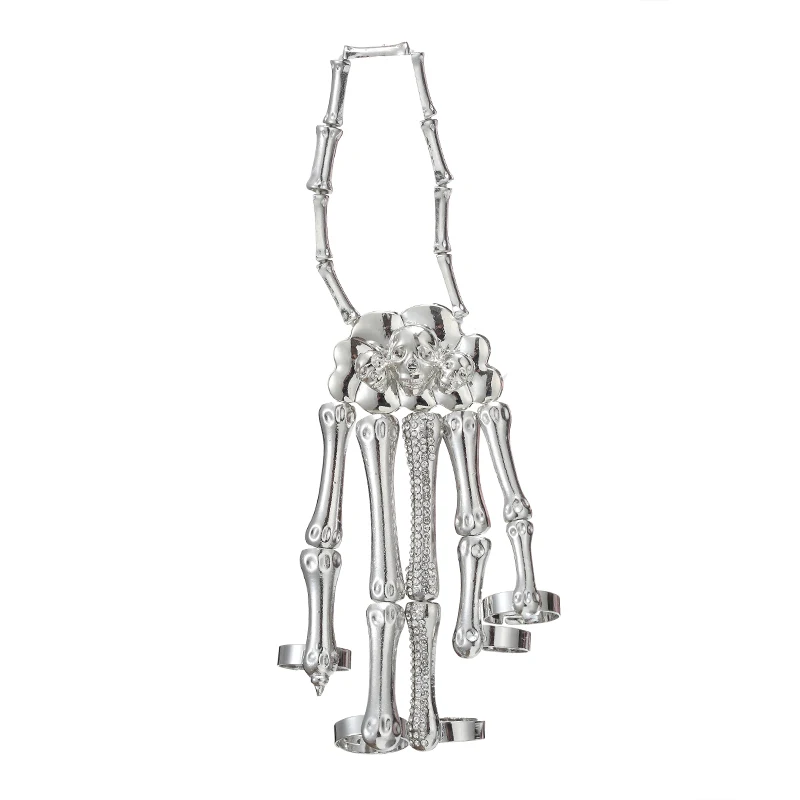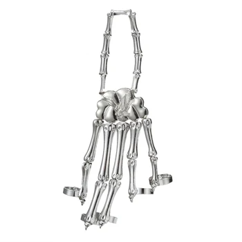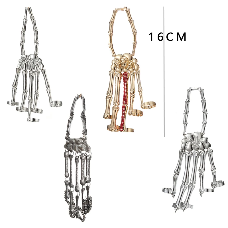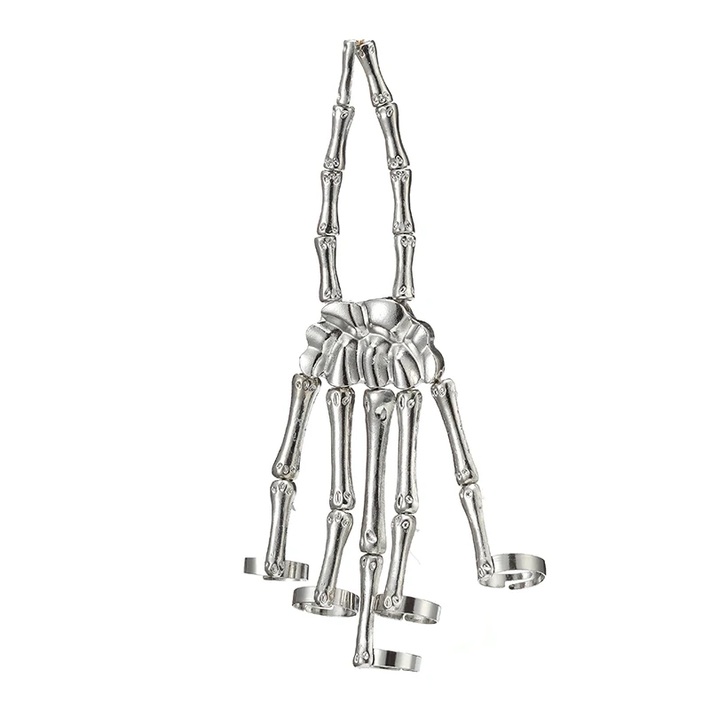 Nombre: pulsera de moda hecha a mano para Halloween, dedos de Calavera, pulsera de mano de esqueleto de Metal con anillo para mujeres, regalos de cumpleaños